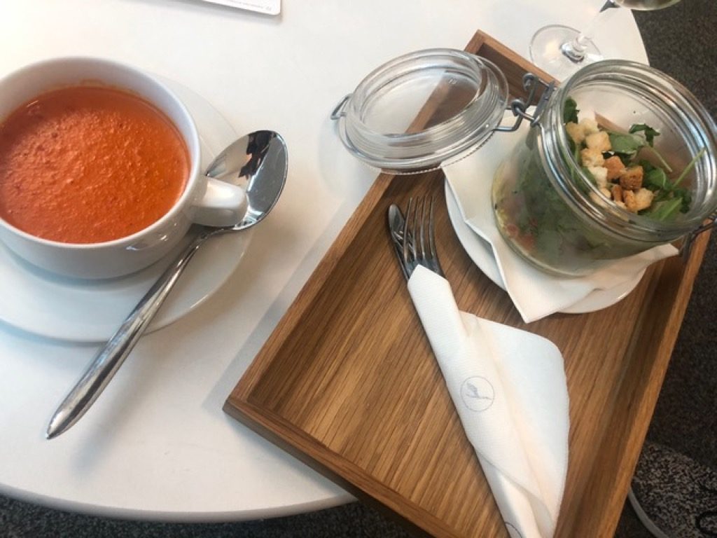 Mein Partner begleitete mich und wir konnten im Vorfeld ohne Probleme auf der Homepage der jeweils durchführenden Airline Sitze reservieren und einchecken. Da es aber Probleme gab gleichzeitig meine Miles&Bonus Nummer der Aegean und die Vielfliegernummer der British Airways für das spätere Leg der LATAM einzulesen gingen wir noch kurz zum leeren Check-In Bereich der Lufthansa und holten uns auch Papierbordkarten ab. Diese sammele ich gerne und fand es interessant eine LATAM Bordkarte in Optik der Lufthansa Group zu ergattern. Nürnberg ist ein Flughafen der kurzen Wege und im Nu sassen wir schon in der Senator Lounge, unmittelbar in der Nähe des späteren Abfluggates nach München. Überrascht stellte ich fest dass es in der Lounge kein Buffet für Speisen mehr gab, vielmehr informiert eine Menükarte über ein individuelles Angebot welches bei den Mitarbeitern bestellt werden konnte. Suppe und Salat hörten sich gut an, die Portionen waren nicht allzu gross aber man konnte hier sicherlich die Bestellung erweitern. Insgesamt eine gute Idee wenn man bedenkt dass ein Buffet permanent und aufwendig sauber gehalten werden muss und mit dem neuen Konzept vielleicht weniger Abfälle entstehen. Darüberhinaus hatte die Bestellung und der Kontakt zu den Mitarbeitern eine persönliche Note.