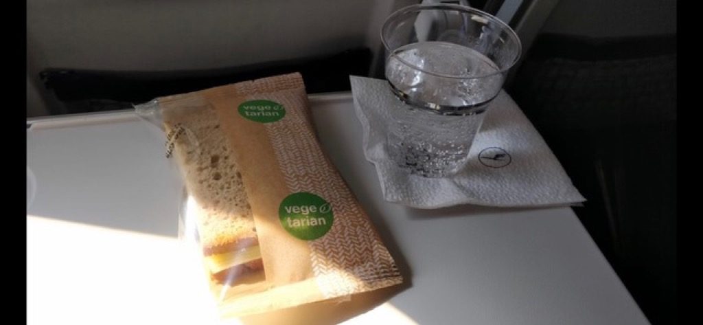 Boarding, push back und take off fanden auch bei diesem Flug zügig und pünktlich statt, die Triebwerke des 320 neo auch für einen Laien als auffällig leise wahrnehmbar. Und jetzt kam auch der Hinweis an die Passagiere über den Engpass der LSG und einem eingeschränkten Service auf diesem Flug- es waren keine Tabletts mit Essen für die Gäste der Business Class beladen und Getränke auf Softdrinks in Plastikbechern beschränkt. Mich persönlich störte das auf dem kurzen Flug gar nicht, zumal ja auch schon der nächste Loungebesuch in greifbare Nähe rückte. Eine Information im Vorfeld wäre dennoch wünschenswert gewesen- zumindest für Gäste der Business Class in Form einer Ansage am Gate oder Benachrichtigung per Push.