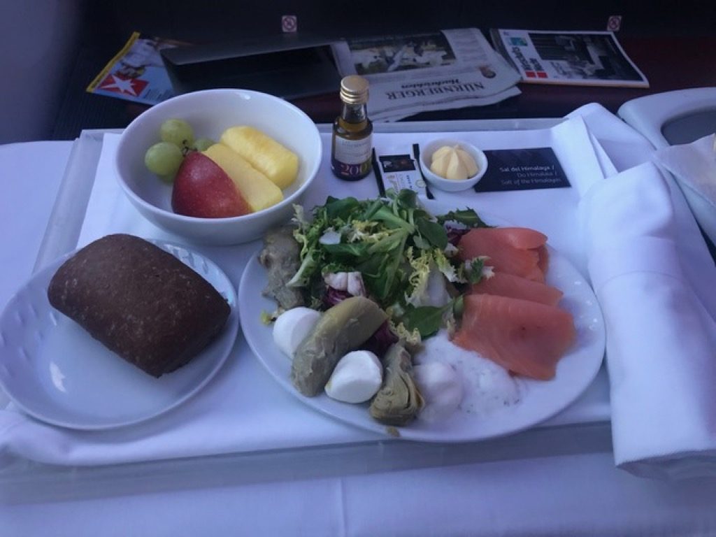 Die Tische wurden eingedeckt und ein Tablett mit einer kalten Platte, Früchten und Schokolade gereicht. Dazu gab es Brötchen aus dem Korb und ich musste gleich an Christophs letzte Review denken als er kaltes und hartes Brot serviert bekommen hat, dies scheint sich inzwischen geändert zu haben denn die Brötchen kamen aus dem Ofen und waren nicht allzu ausgetrocknet. Dieser Verbesserung steht allerdings eine Verschlechterung gegenüber: den Pisco Sour, das Nationalgetränk in Chile und Peru ist nicht mehr erhältlich. Schade, denn durch solch einprägsame lokale Spezialitäten kann man sich meiner Meinung nach gut differenzieren und seinen Gästen etwas landestypisches präsentieren. Immerhin gab es gleich sechs verschiedene Weine, auch hier hätte ich mir eine Menükarte einfach zur besseren Übersicht gewünscht, die Flugbegleiter waren aber geduldig und sprachen auch Empfehlungen aus.