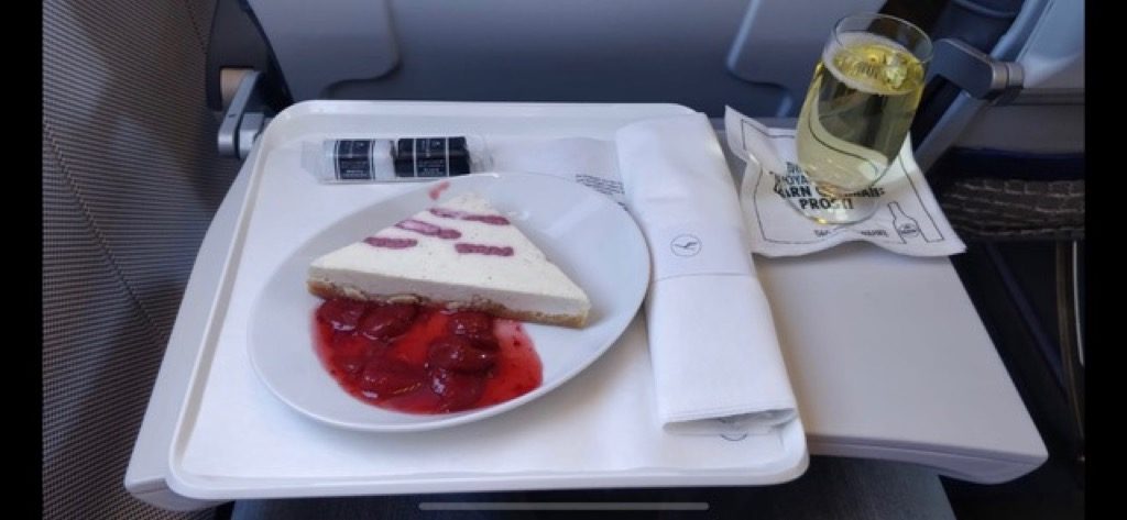 In der Businessclass bietet die Lufthansa (genaugenommen war es in diesem Fall die Cityline) an Bord immer einen freien Nebensitz und auch auf kurzen Strecken einen Imbiss mit Getränken. Obwohl ich diese Tage von Engpässen bei der LSG (dem hauseigenen Cateringbetrieb der LH) gelesen habe gab es auf diesem Flug keine Einschränkungen und ich erfreute mich an einem Käsekuchen mit Erdbeeren und einem Glas Winzersekt.