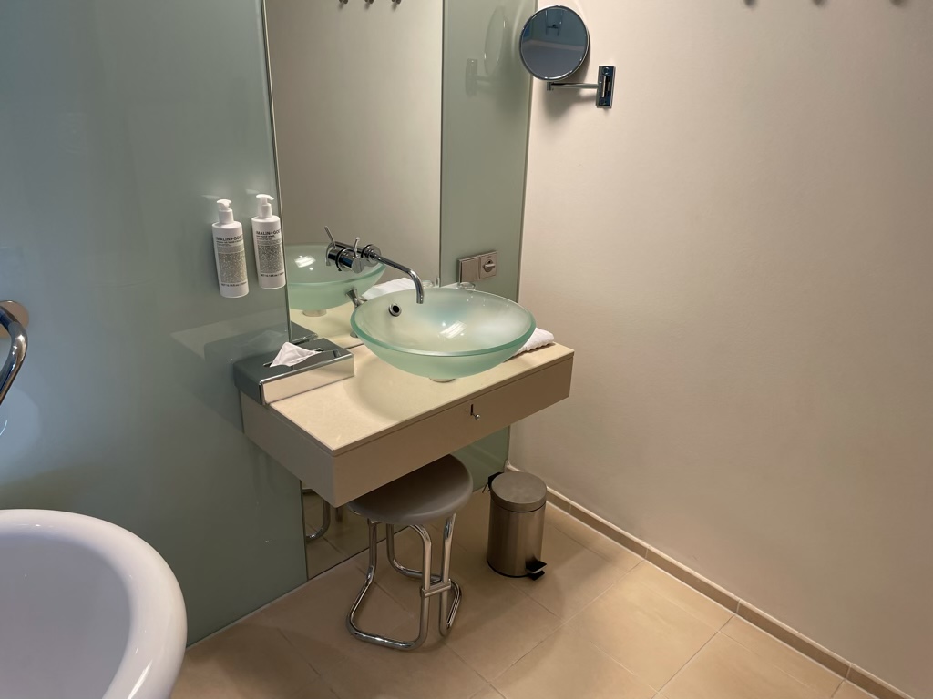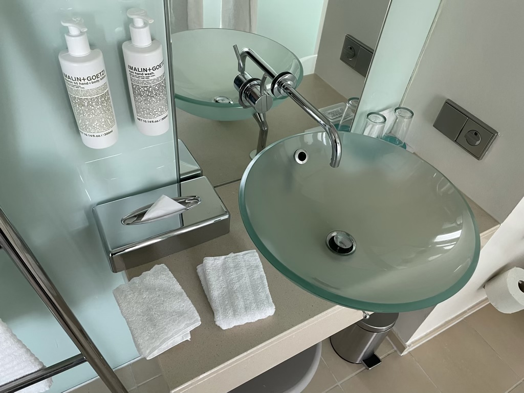 Dass es Seife, Shampoo etc. nur noch in großen Flaschen an der Wand gibt ist bei Le Meridien Standard. Ich finde das auch richtig, da so Unmengen an Plastikmüll vermieden werden. Schön ist auch, dass Seife, Shampoo etc. von Malin+Goetz sind. So hochwertige und teure Amenities sind in Hotels dieser Preisklasse sehr selten.