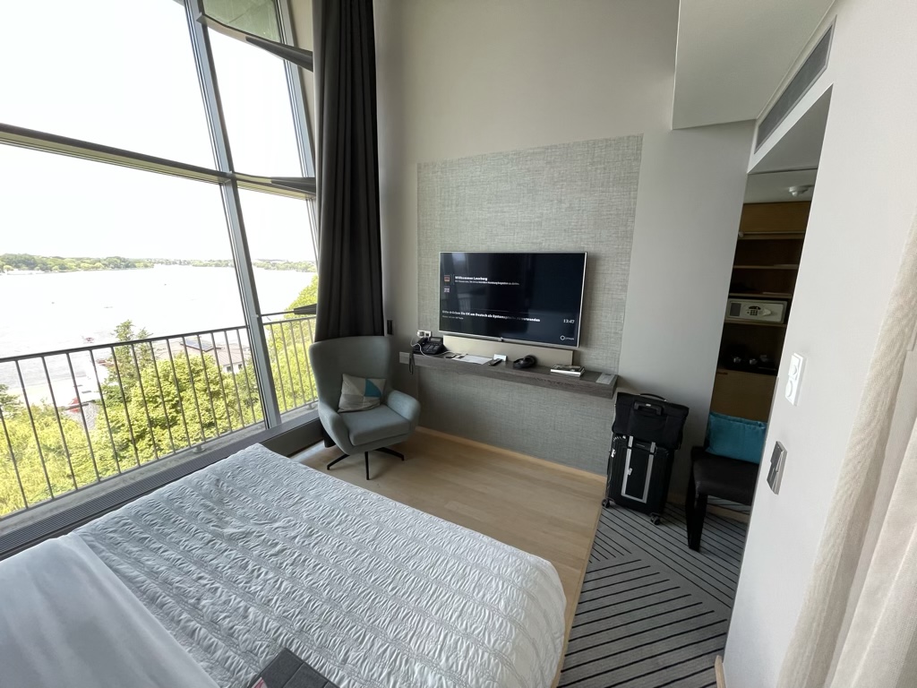 Dabei war zwar die Aussaht vom Schreibtisch gigantisch gut, aber ich hätte mir hier etwas mehr Steckdosen und USB Anschlüsse gewünscht, denn faktisch gab es nur eine Steckdose in Reichweite an der Wand am Schreibtisch.