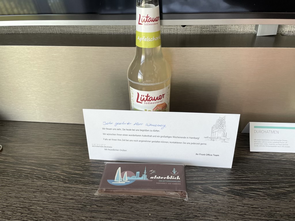 Als Welcome Amenity hatte man mir eine Apfelschorle, eine Karte und eine kleine Schokolade ins Zimmer gestellt. Alles nicht die Welt, aber eine nette Geste, über welche ich mich immer freue, was auch die Idee dahinter sein sollte.