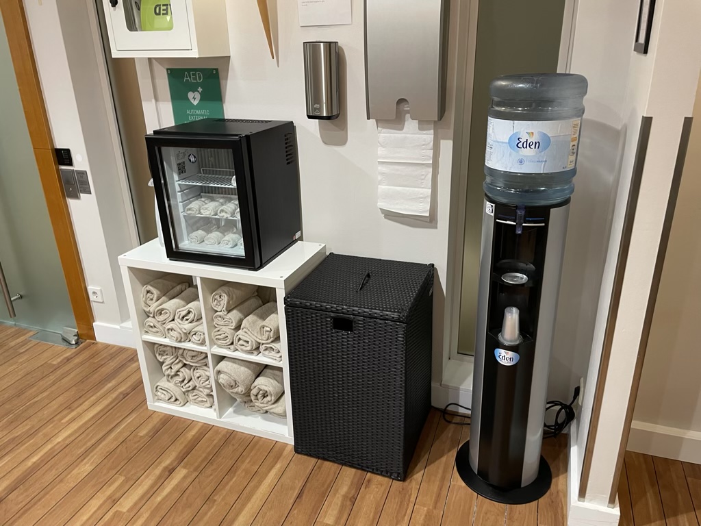 Grundsätzlich fand ich toll, dass es neben den Handtüchern auch einen Kühlschrank mit kalten Tüchern gab. Allerdings finde ich es immer schade, wenn man in einem Hotel Gym nur einen Wasserspender hat und keine Flaschen, denn die Becher finde ich sehr unpraktisch. Dass man mit Plastik Flaschen deutlich mehr Plastikmüll produziert als mit Plastikbechern, fällt mir auch aus Nachhaltigkeitsaspekten schwer zu glauben.