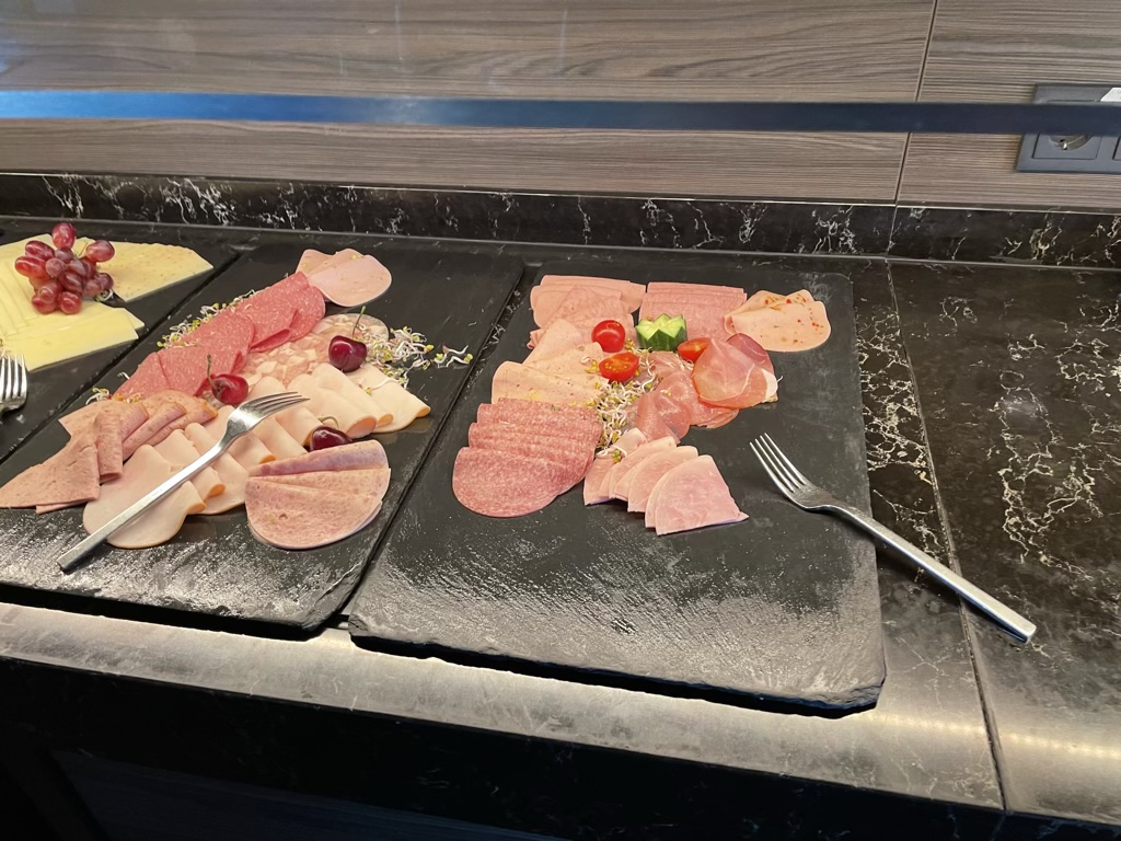Das Frühstück wird auf einem überraschend kleinen Buffett serviert, was auch dazu führte, dass es hier und da etwas staute. Dabei sollte aber klein nicht wenig Auswahl bedeuten, vielmehr wurde alles sehr regelmäßig fisch aufgefüllt.