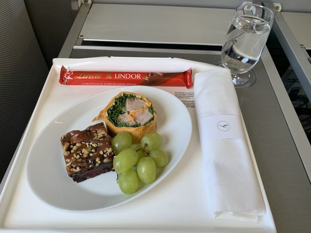 Zügig nach dem Start wurden die Anschnallzeichen ausgeschaltet und es wurde mit dem Service begonnen. Ausgeteilt wurden Tabletts, mit einem Thunfischwrap, einem Schokokuchen, Trauben und Lindt Schokolade. Die Qualität der Speisen und Getränke war absolut in Ordnung, die Größen ebenfalls. Auf dem Flug von Frankfurt nach Berlin Tegel war die Crew stets freundlich und proaktiv. Unsere Getränke wurden zu jeder Zeit aufgefüllt.