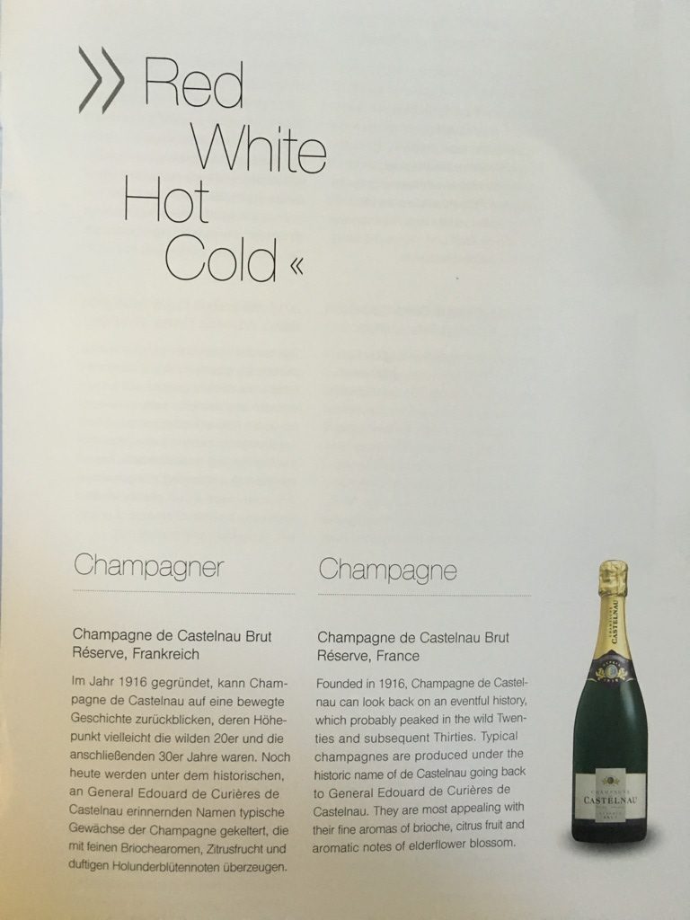 Nachdem ich mich auf meinem Platz häuslich eingerichtet hatte, wurde mir ein Willkommens Dirnk angeboten. Wie immer bei Lufthansa in der Business Class werden von einem Tablett Sekt, Orangen Saft und Wasser angeboten. Es gibt durchaus Lufthansa Crews, welche bereits am Boden eine open bar anbieten, allerdings ist dies die Ausnahme.