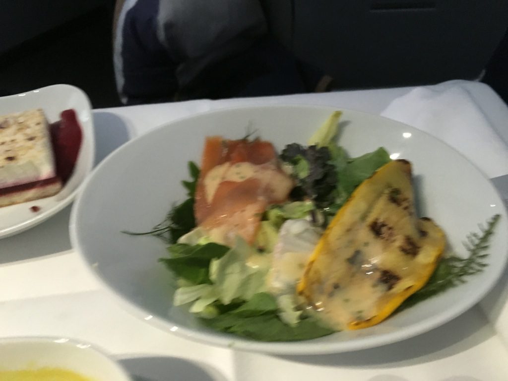 Trotz meiner Kritik am Service sieht der fertig eingedeckte Tisch ohne Tablett deutlich besser aus, als mit Tablett. Auch die Vorspeise war auf diesem Flug wirklich gut!