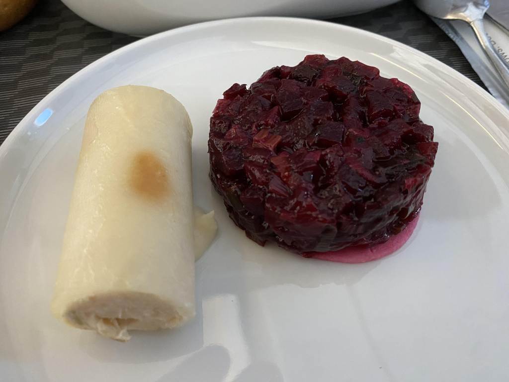 Ab Reihe 6 – also ab Hälfte der Business Class – gab es kein Fleischgericht mehr, sondern nur noch die vegetarische Variante.