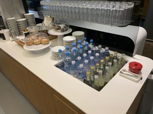 Wir haben die Lounge um die Mittagszeit besucht, das Catering war dementsprechend angepasst. Neben zwei warmen Alternativen gab es noch eine kleine Salatbar und eine Auswahl an Nachtischen. Selbstverständlich ist auch hier der typische WMF Kaffeevollautomat installiert. Beeindruckt hat Christoph die Spirituosenauswahl, welche für eine Business Lounge mit bspw. verschiedenen Sorten Gin nicht üblich war. Alle Speisen waren schön angerichtet. Das Buffet wurde regelmäßig gereinigt und aufgefüllt. Alles in allem hat das angebotene Catering einen guten Eindruck hinterlassen.