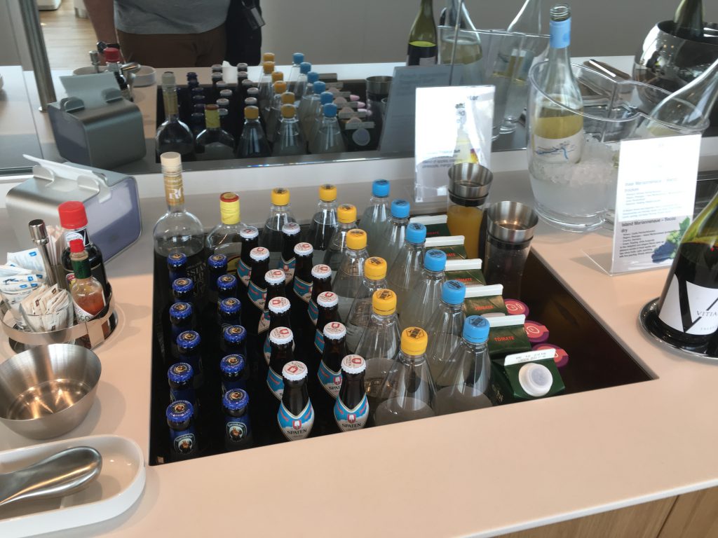 Alkoholfreie Getränke und Säfte standen ebenfalls auf dem Buffet bereit. Interessanterweise standen alkoholische Getränke nicht wie in anderen Lufthansa Business Lounges offen auf dem Buffet, diese kann man sich aber von einem Barkeeper an der wunderschönen Bar ausschenken lassen. Hier gibt es bei Vorfeldblick die üblichen Spirituosen, Bier, Wein und Sekt.