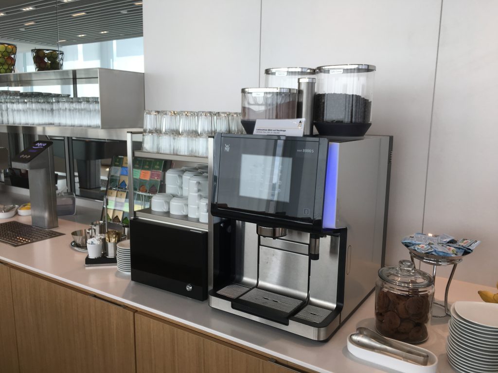 Was natürlich nicht fehlen darf in einer Lufthansa Lounge, ist der WMF-Kaffeevollautomat. Besonders am Morgen ist dieser im Dauereinsatz.