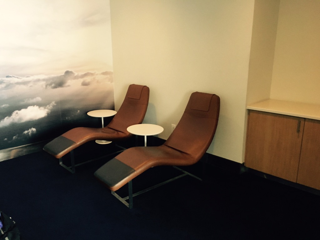 In zwei kleine Nebenräumen der Lufthansa Business Lounge New York JFK befindet sich neben einem Fernsehzimmer auch ein kleiner Ruheraum mit vier Liegen.