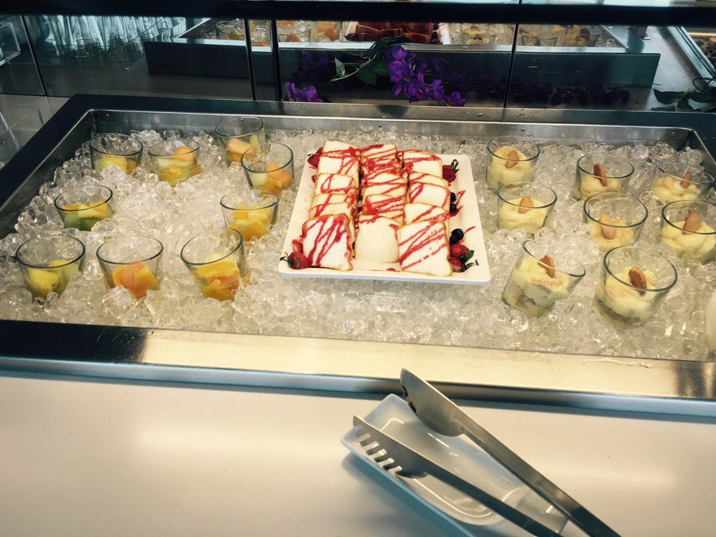 An einem Buffet wurden Speisen und Getränke zur Selbstbedienung angeboten. Das Angebot war dabei für eine Business Lounge überraschend gut und konnte fast mit der Senator Lounge ein Stockwerk höher mithalten. Neben einigen Salaten und kleinen Desserts, wurde auch Pizza angeboten.