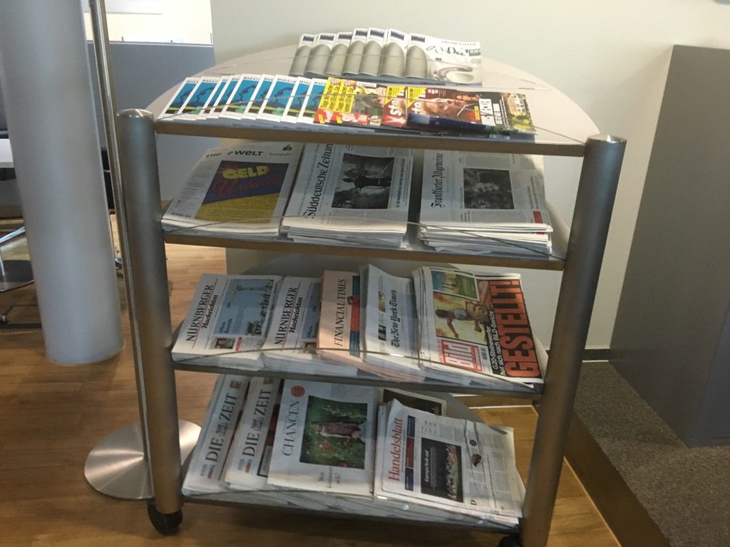 Natürlich gibt es auch in der Lufthansa Business Lounge Nürnberg kostenloses WIFI Internet und Zeitschriften. Die Toiletten teilt sie sich mit der Senator Lounge nebenan.