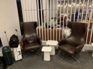 Betretet Ihr die Lounge durch die automatischen Schiebetüren, befindet sich der Empfang zur rechten Hand. Dort könnt Ihr Euren Boarding Pass scannen und erhaltet Zugang zur Lounge. Gegenüber der Rezeption befindet sich eine erste bequeme Sitzgruppe.