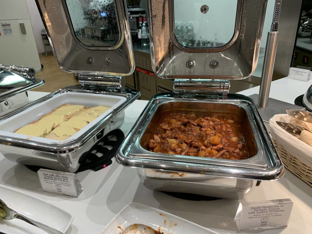 Das Getränke- und Speisen-Angebot hat uns wirklich sehr positiv überrascht. Wer einen Snack oder eine volle Mahlzeit genießen will, findet drei Bereiche, in dem man sich bedienen kann. Da ist zum einen ein Büffet mit Vorspeisen, wie Salaten und Tapas. Der Bereich mit warmen Speisen, an dem es während unseres Besuches zwei Suppen und vier warme Gerichte gab, befindet sich auf der Ecke zur Bar. Zu den Tagesgerichten zählten zum Beispiel Tintenfisch in Tomaten-Soße oder Schweine-Lende. Zu guter Letzt gibt es noch eine Station mit Nachtisch, wie Kuchen und Obst, und Snacks, wie Bruschetta und Focacchia.
