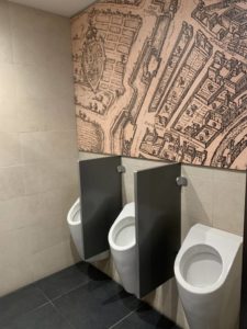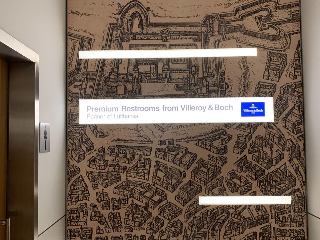 Der Zugang zu den Toiletten befindet sich hinter einer Glasschiebetür. Dort werdet Ihr mit einem „Premium Restrooms by Villeroy & Boch“ empfangen. Der komplette Bereich ist ziemlich stylisch eingerichtet. Die Toiletten waren bei unserem Besuch sehr sauber.