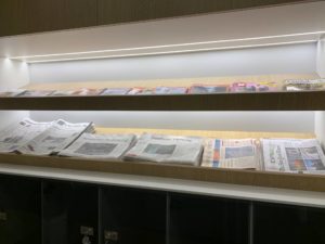 Die Lounge selbst ist L-förmig angelegt. Der vorderer Bereich ist dabei ein lang gezogener Gang, in dem sich links immer wieder unterschiedliche Sitzgelegenheiten, unter anderem zwei Sessel in einer Nische mit etwas mehr Privatsphäre, befinden. An der rechten Seite findet Ihr zunächst ein Zeitungs- und Zeitschriften-Regal, dann den Zugang zu den Toiletten und anschließend ein Getränke-Counter und Essens-Büfett.