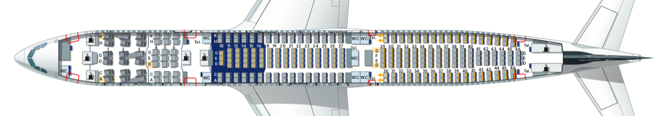 Mit genau 300 Sitzplätzen ist es für einen Airbus A340-300 tatsächlich eine sehr Economy Class-lastige Bestuhlung und man kennt so viele Sitze teilweise nur von Charter Airlines. Zum Vergleich: Lufthansa hat den Airbus A340-300 auch schon mit nur 180 Sitzplätzen ausgestattet, als es hier noch eine First Class gab.