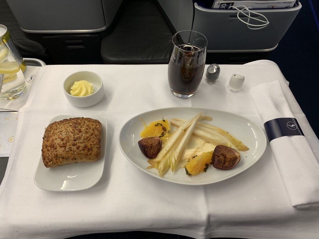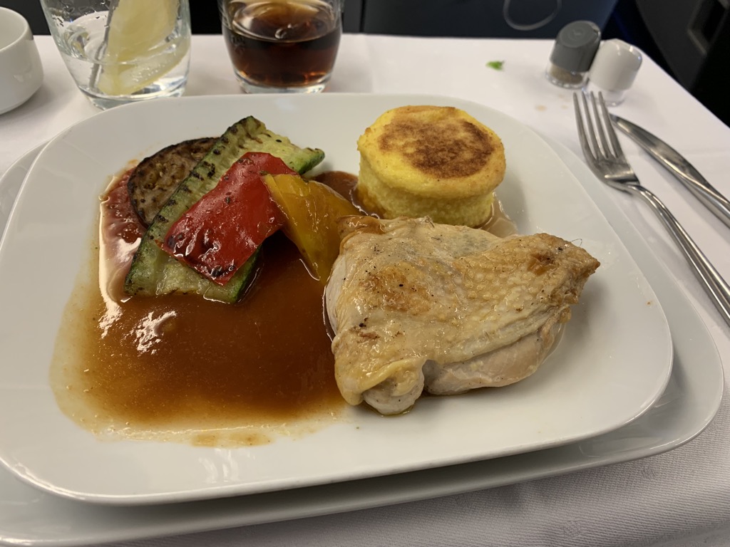 Das Perlhuhn gehört zu den besten Gerichten, welche ich in der Business Class je serviert bekommen habe. Auch wenn man es sicher nicht mit einem Restaurant am Boden vergleichen darf, für Flugzeug Standards ist es ein wirklich gutes Gericht.