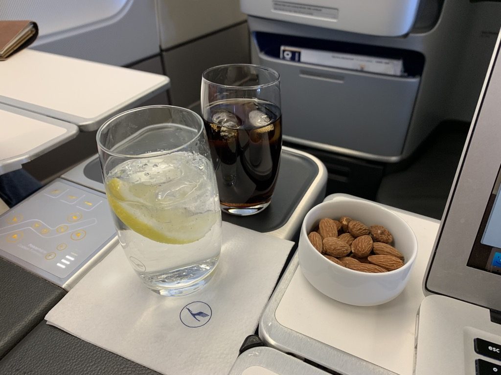 Nach dem Start wird sehr zügig mit dem Service begonnen. So werden zuerst alle Passagiere mit einem Apperetiv und Nüssen versorgt, bevor der eigentliche Service beginnt. Hier kann man die Vorzüge einer kleinen Business Class wieder ausspielen, denn beim Servieren der ersten Getränke werden dann auch die Essenswünsche mit ein wenig Small Talk abgefragt.