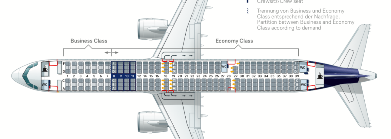 In der Realität wird man die Flugzeuge wohl nur sehr selten mit 215 Passagieren besetzen, denn in den Vorderen Reihen ist die Business Class untergebracht, welche zwar die identischen Sitze wie in der Economy Class hat, allerdings ist hier der Mittelsitz blockiert, wodurch die Business Class Passagiere nie einen direkten Nachbarn haben und etwas mehr Komfort genießen sollen.