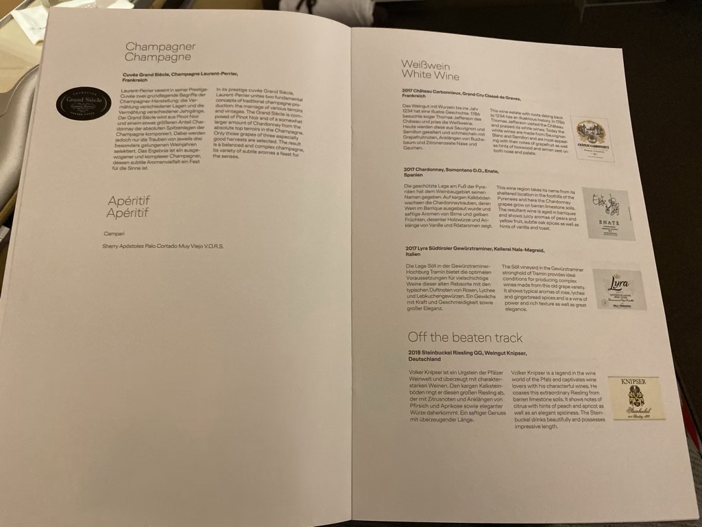 Direkt nach dem Einsteigen wurden wir herzlich begrüßt und nach unseren Getränkewünschen zur Begrüßung gefragt. Christoph freute sich bereits auf den Champagner, ich war mit einem Wasser glücklich. Hierzu wurde ein heißes Tuch und ein Amuse Gueule gereicht, welches uns beiden geschmeckt hat.