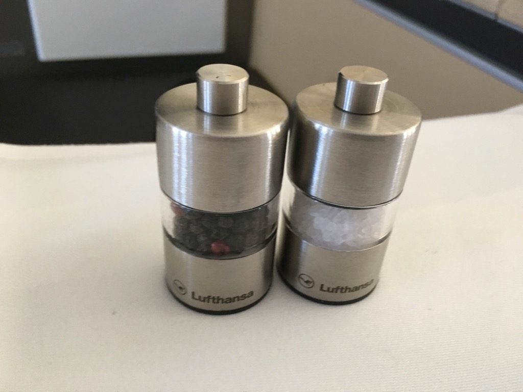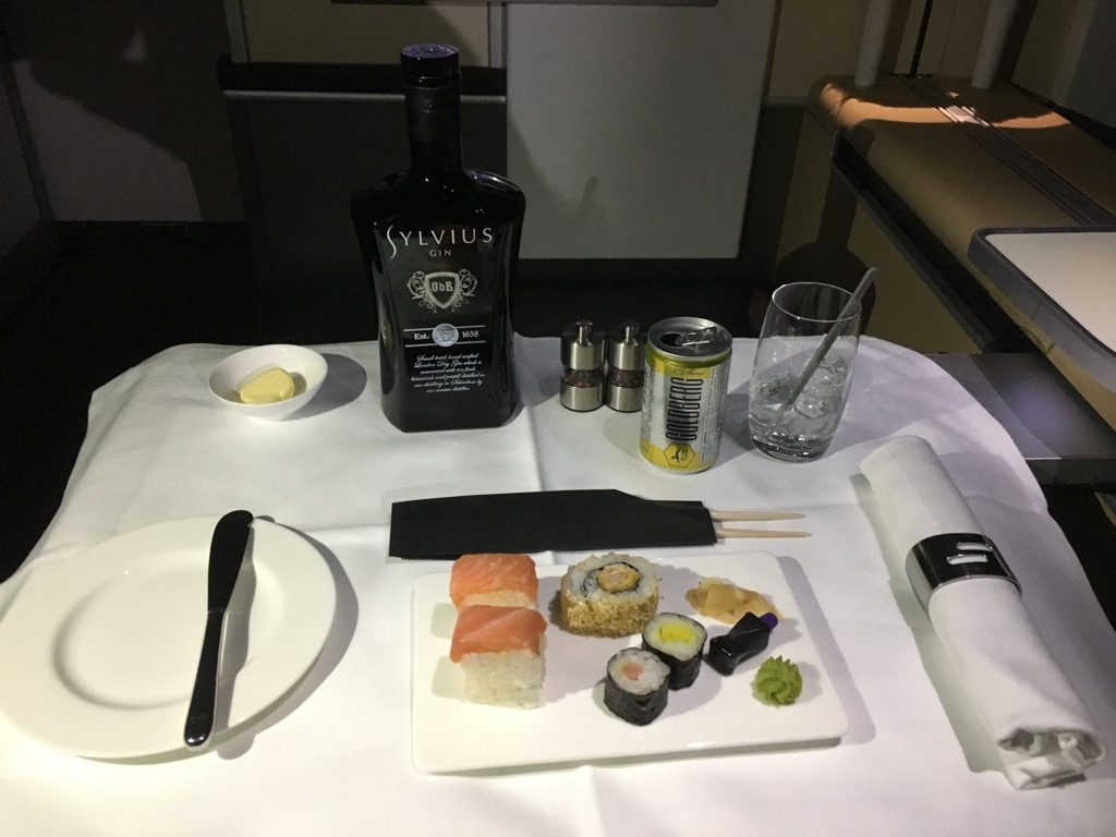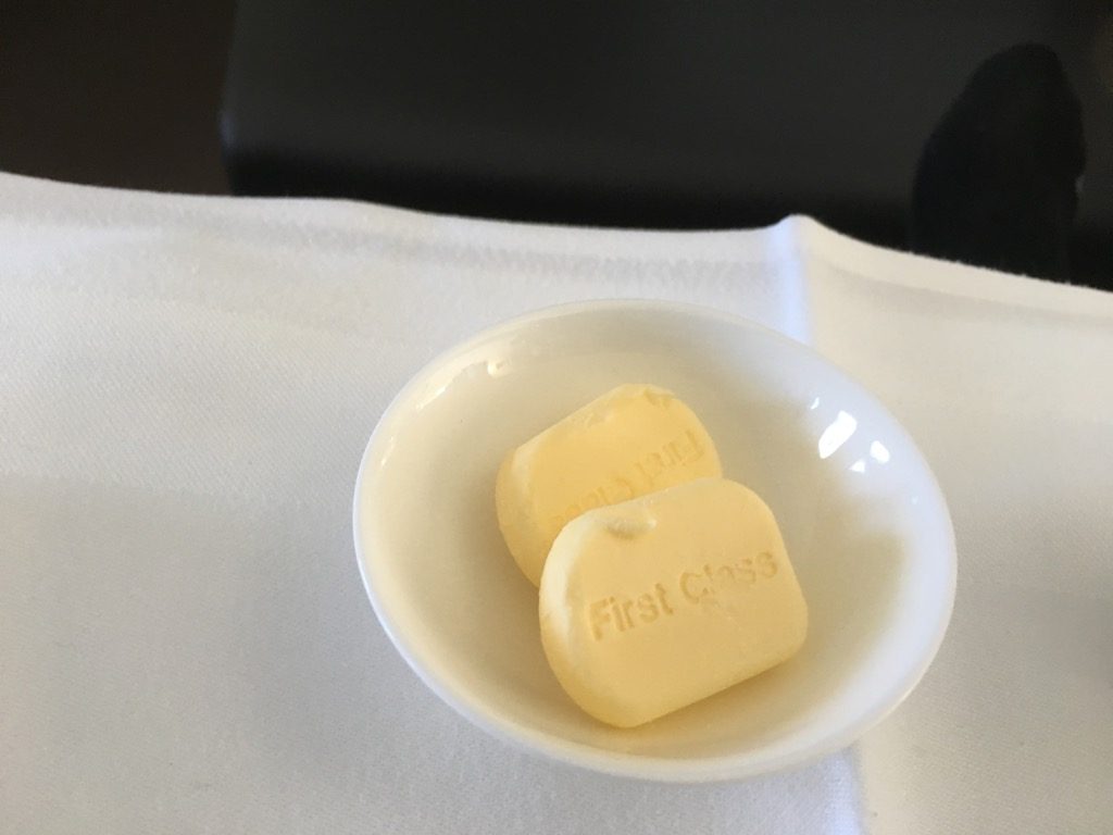 Nach einer kurzen Wartezeit im Finger konnten wir nach einer freundlichen Begrüßung seitens der Crew nach links in die First Class abbiegen. Hier wurden uns auch direkt unsere Plätze gezeigt und wir wurden mit je einem Pyjama und Amenity Kit versorgt. Unser Handgepäck wurde in Schränken verstaut und wir wurden gefragt was wir trinken möchten.