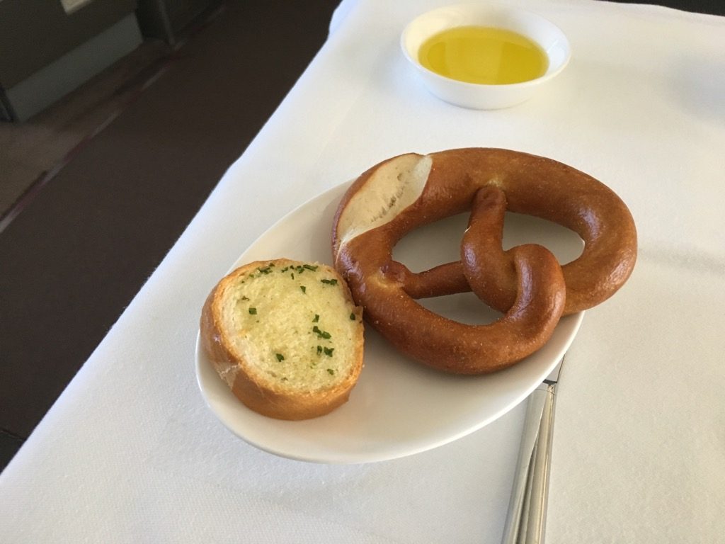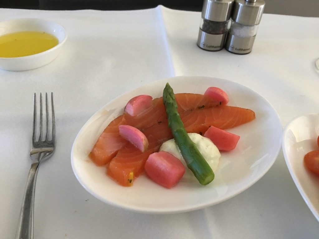 Direkt nach dem Start wurde mit dem ersten Service begonnen. Neben dem Abfragen unserer Getränkewünsche, wurde auch mit dem vorab ausgesuchten Menü begonnen. Zu Beginn wurde eine Auswahl an Backwaren gereicht, mit Butter, Olivenöl, Salz und Pfeffer. Danach ging es wie üblich mir einem Kaviargang weiter, der von einem Wagen aus durchgeführt wurde.