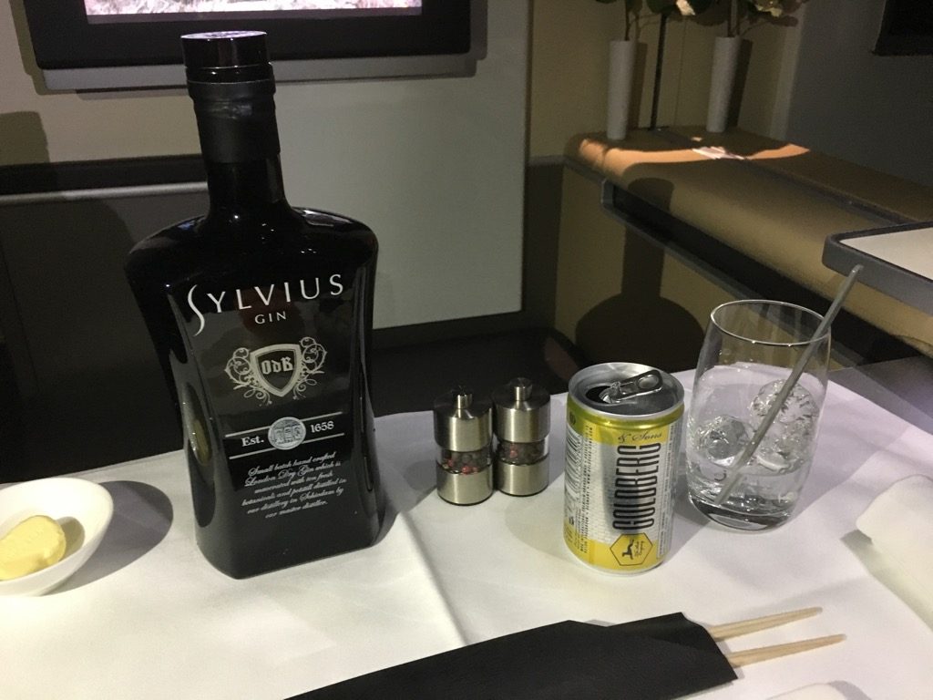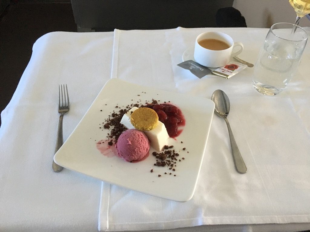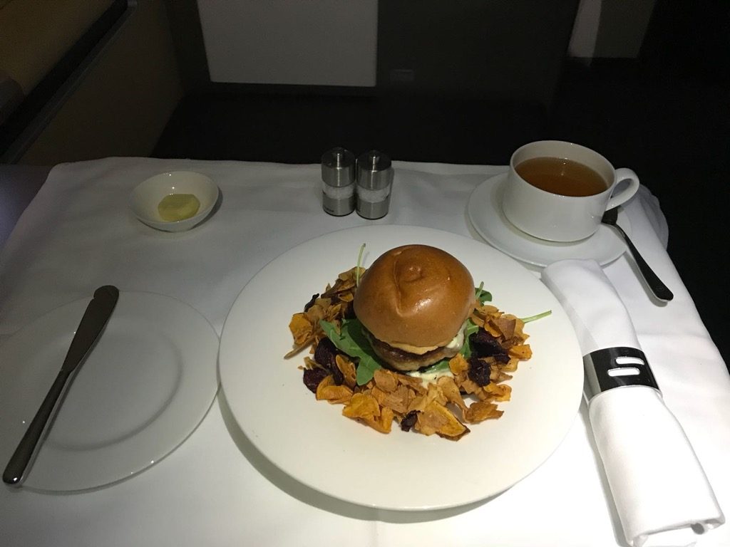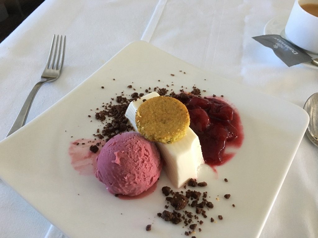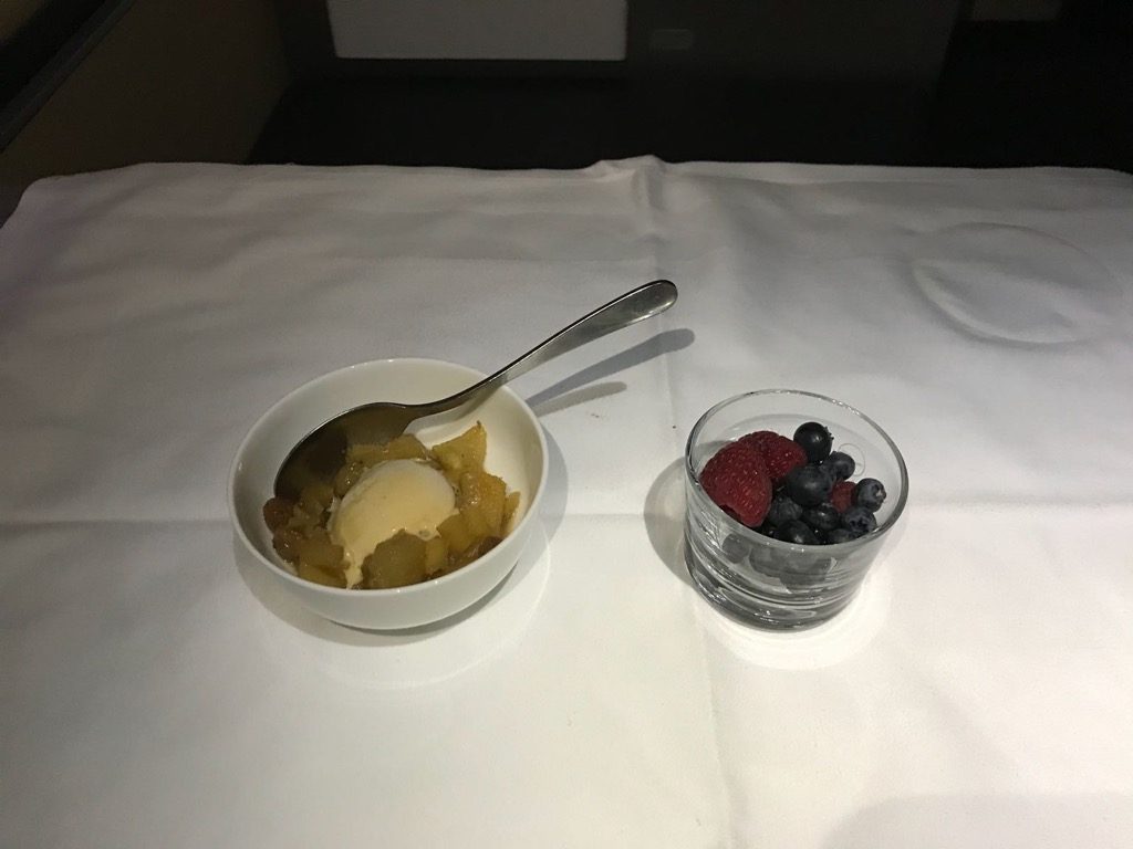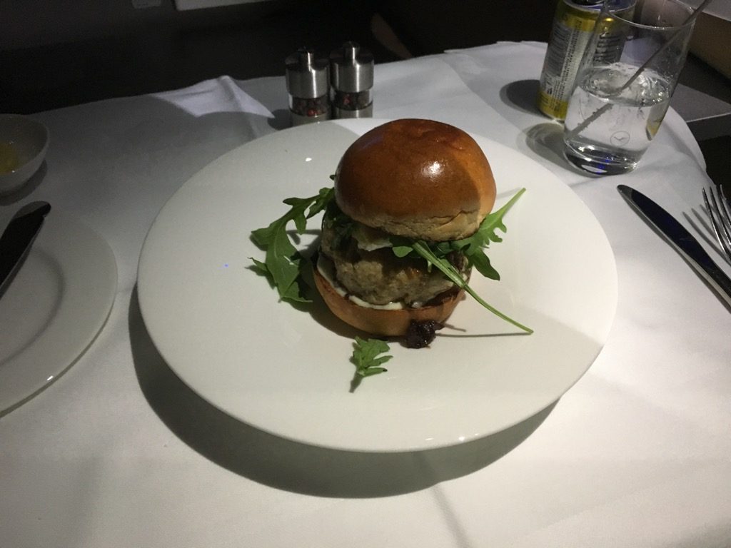 Etwa eineinhalb Stunden vor der Landung bekam ich Hunger und bestellte mir den Burger von der Snack Karte. Hier lässt sich ausnahmsweise mal wirklich der Begriff „Food-Porn“ verwenden. Der Burger hat unglaublich gut geschmeckt. Auch Christoph, der ihn probieren durfte, war so beeindruckt, dass er sich nach dem Sushi auch einen bestellte. Als Dessert gab es für mich dann noch Karamelleis und Beeren. Christoph bevorzugte einen „flüssigen Nachtisch“ in Form eines weiteren Gin & Tonic, immerhin war die „Spirituose des Monats“ auf diesem Flug ein Gin welchen er noch nicht kannte.