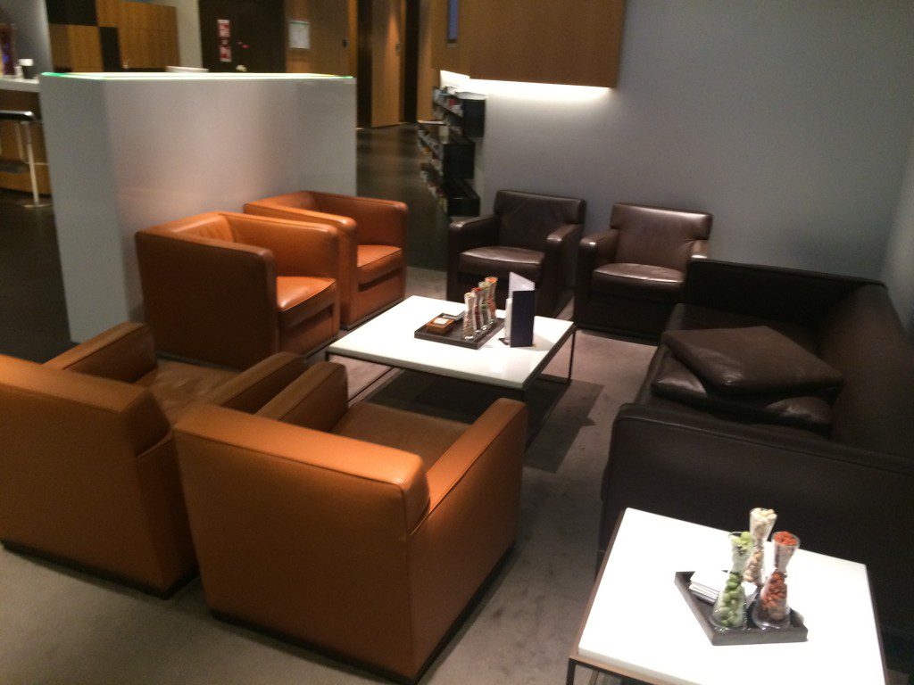 Neben einigen Ruhesesseln, die an der Fensterfront stehen, gibt es verschiedene Sitzgruppen mit Couches und Sesseln. Alle Einrichtungselemente sind in dunklen Erdtönen gehalten, was der Lounge eine sehr gediegene Atmosphäre verleiht. Auf den Tischen innerhalb der Sessellandschaften steht überall eine Auswahl an Nüssen und Trockenfrüchten als Snacks bereit.