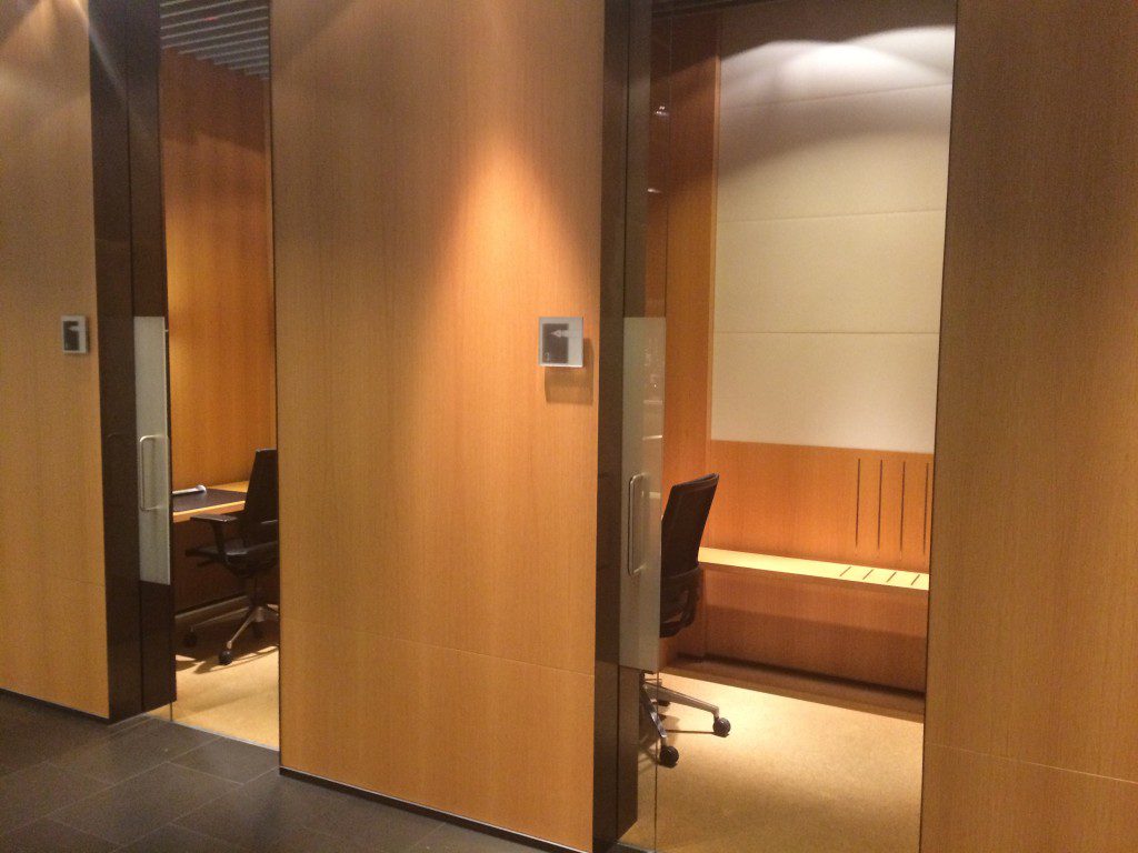 Auf der rechten Seite nach dem Eingang befinden sich die Workstations. Diese kleinen Räume sind absolut funktional eingerichtet. Neben einem Schreibtisch inklusive Schreibmaterial und Telefon, stehen in zwei der vier Workstations auch Computer zur Verfügung. Natürlich findet Ihr hier auch einige Steckdosen. WLAN ist in der gesamten Lounge vorhanden.
