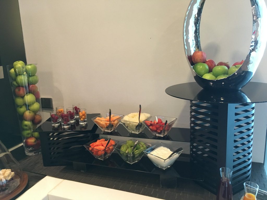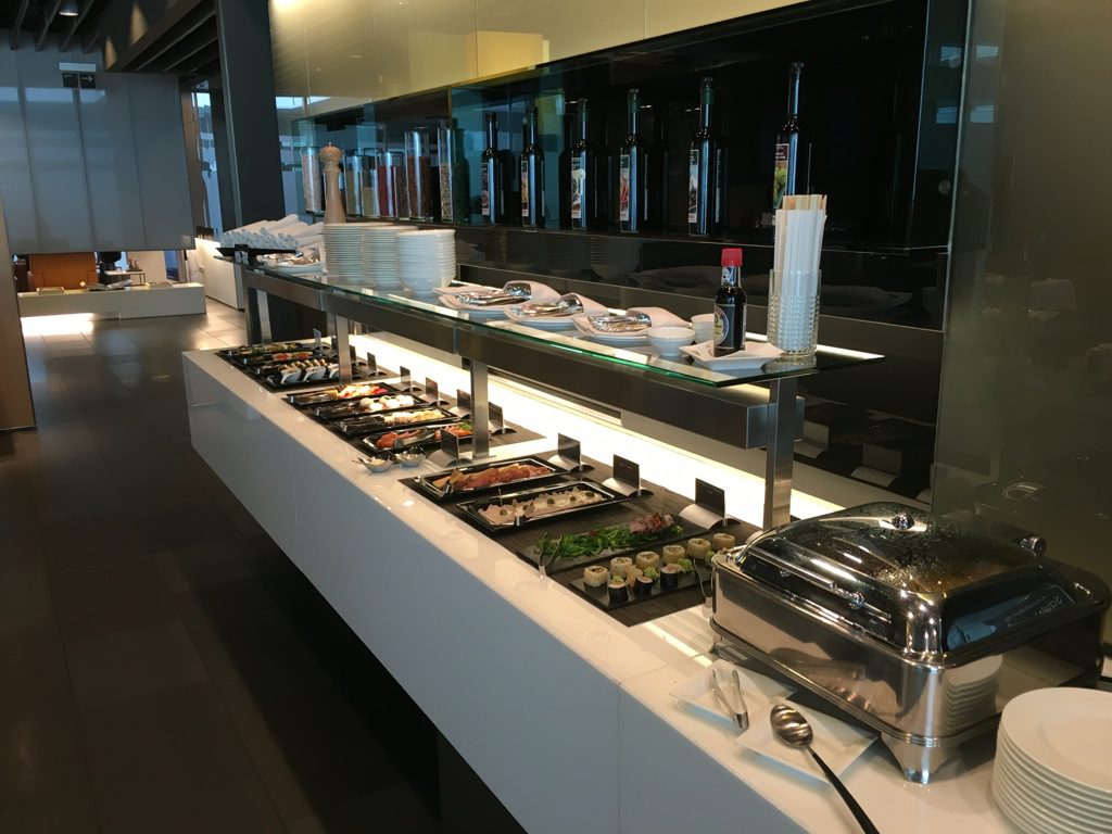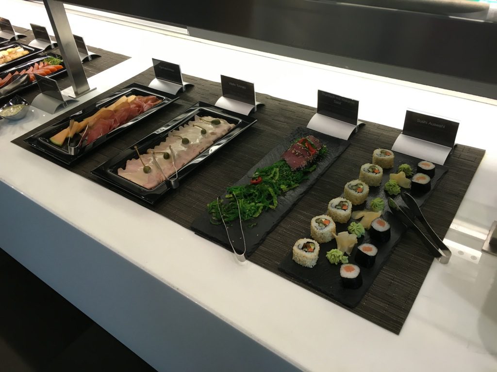 Für Vorspeisen, sowie besonders eilige Gäste gibt es ein kleines Buffet. Hier wird eine Außwahl an Vorspeisen oder Snacks, sowie Desserts angeboten. Auch ein wechselndes warmes Gericht gibt es immer auf dem Buffet. Dies ist insbesondere praktisch, wenn man nur wenige Minuten in der Lounge zum Essen hat. Allerdings kann die Küche auch einige Gerichte sehr schnell <10Minuten zubereiten. Wenn Ihr den Kellnern mitteilt wie viel Zeit Ihr habt, wird man Euch noch fast immer etwas frisch gekochtes servieren können.