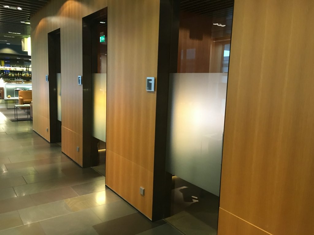 Hinter den Workstations befinden sich die Toiletten, sowie die Duschen. Einer der Duschräume verfügt auch über eine Badewanne. Übrigens bekommt Ihr von den Damen bei den Duschen auch die berühmten Lufthansa First Class Badeenten.