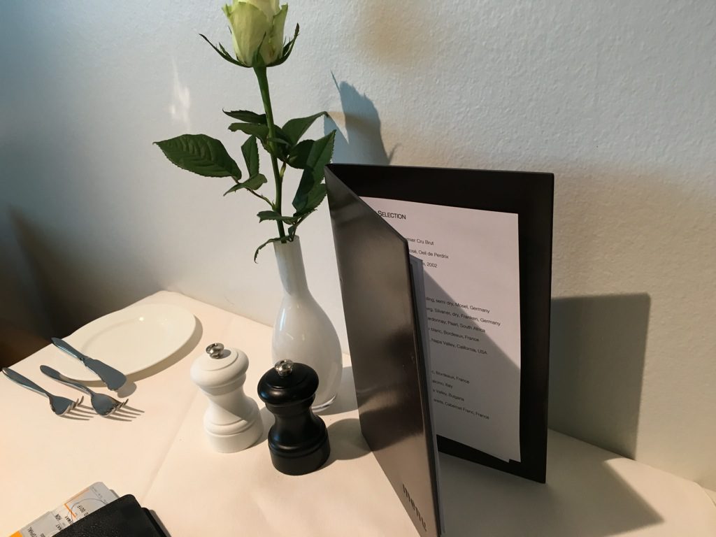 Grundsätzlich findet man zwar in der ganzen Lounge verteilt allerlei Leckereien, wie Pralinen, Kuchen oder frisches Obst. Die Lufthansa First Class Lounge München verfügt allerdings über ein bedientes á la carte Restaurant. Hier könnt Ihr von einer kleine Karte verschiedene Gerichte bestellen. Die angebotenen Speisen werden regelmäßig überarbeitet, sodass es auch den Vielfliegern nicht langweilig wird, aber auch saisonale Gerichte frisch angeboten werden können.