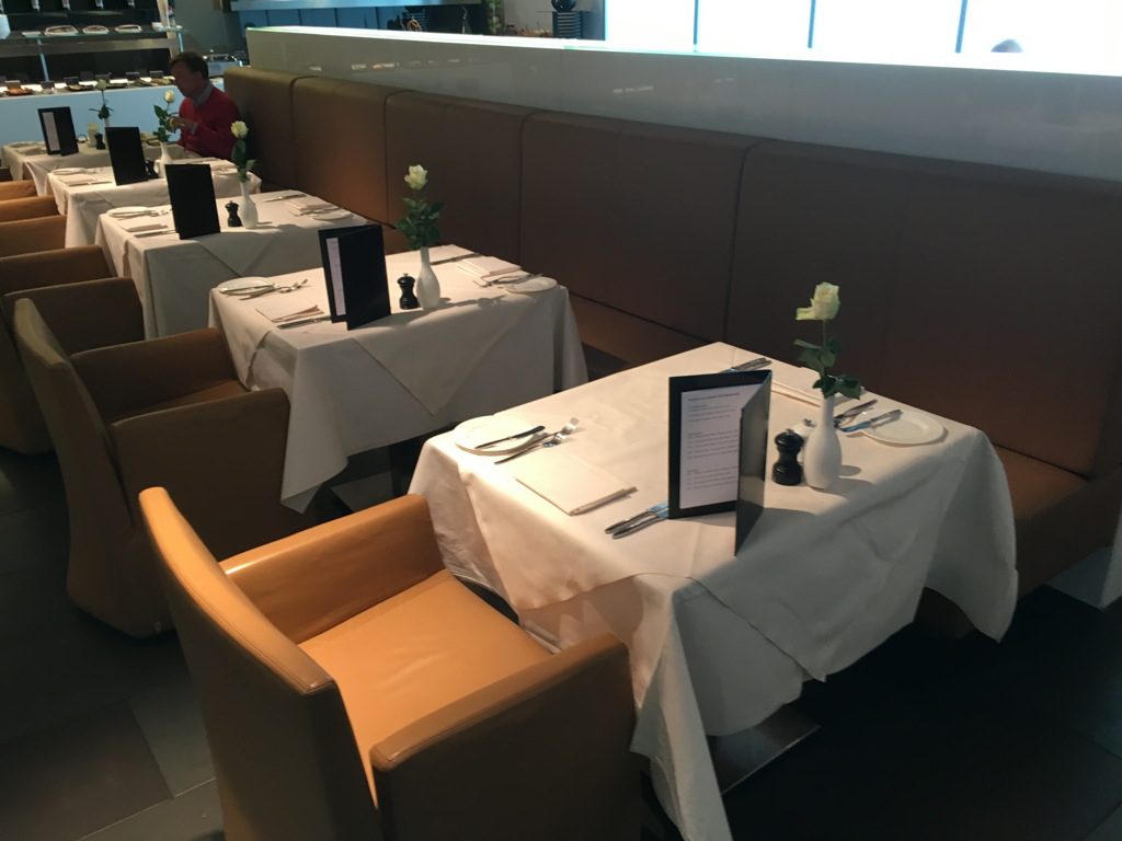 Direkt nach dem Eintreten in die Lounge gelangt man rechts zum Bar und Restaurant Bereich der Lounge, welcher einen großen Teil der Lounge einnimmt. Hier befinden sich eine Vielzahl an Tischen im Lufthansa First Class Lounge üblichen Design.