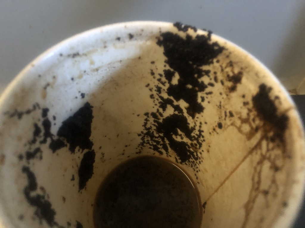 Den Kaffee muss man also zwingend mit diesem Aufsatz trinken, spätestens da funktioniert es nicht mehr ohne Kunststoff. Unter dem Deckel sieht es dann alles andere als appetitlich aus.