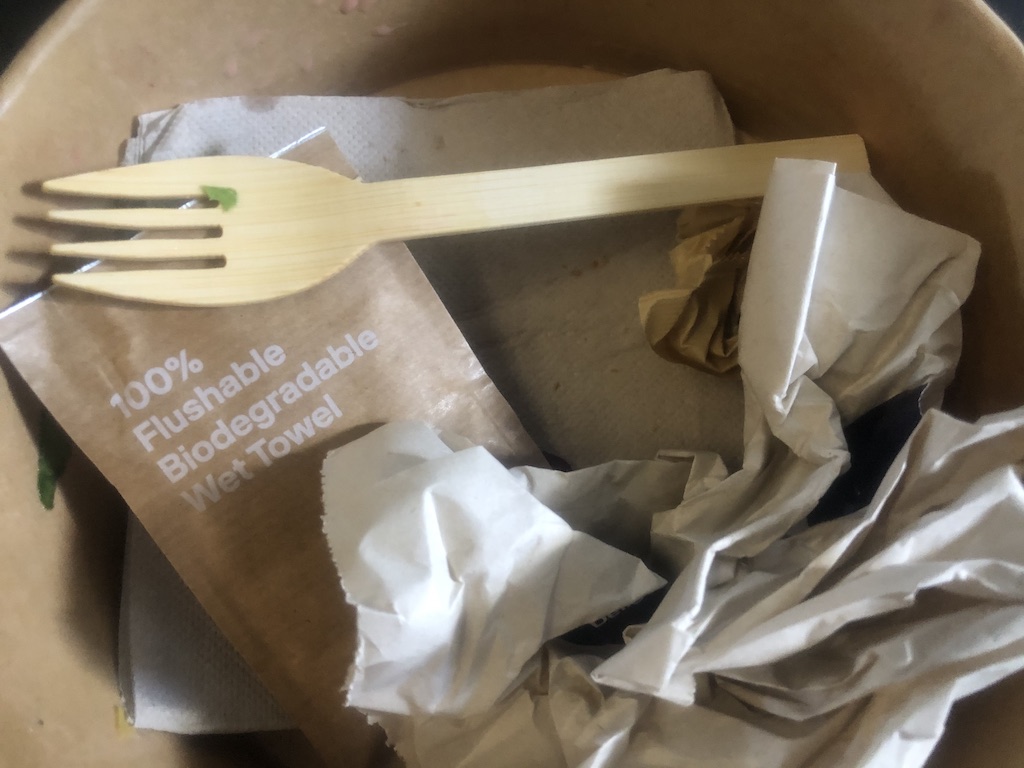 Insgesamt aber ein leckerer Imbiss, der satt macht und nicht zu schwer im Magen liegt. Mit dem neuen Angebot will man auch auf den Zug der Nachhaltigkeit aufspringen und widmet dem Thema eine ganze Seite in der Menükarte. Ganz ohne Verpackung kommt man natürlich nicht aus, es soll aber überwiegend Recyclingpapier und kaum Plastik verwendet werden.