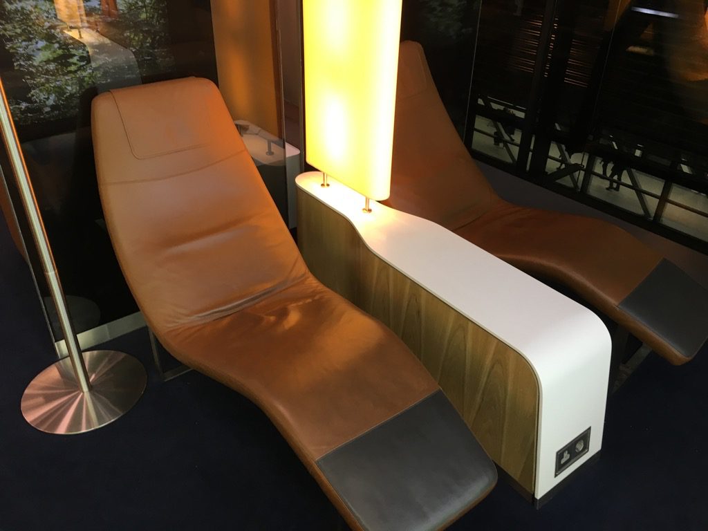 Die Lounge verfügt über die neuste Lufthansa Senator Lounge Einrichtung in gedeckten Brauntönen. Entlang der Fenster zum Terminal findet man eine Reihe von Sesseln, sowie einige Ruheliegen.