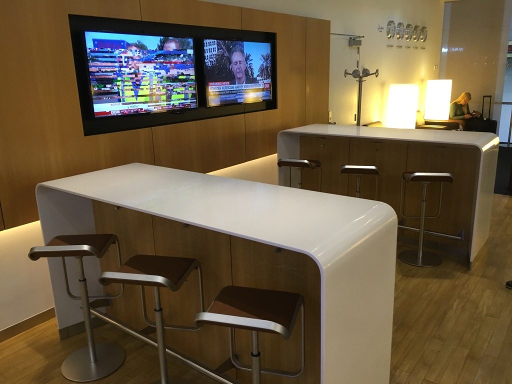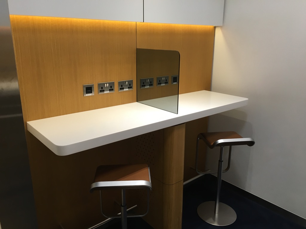 Im vorderen Bereich befinden sich einige Hochtische, der Bistrobereich, sowie das Buffet. Besonders der Bistrobereich ist recht groß, was Sinn macht, da bei den sehr späten Abflügen der Lufthansa und Swiss aus Dubai die meisten Passagiere vermutlich in der Lounge noch etwas essen und im Flugzeug direkt schlafen wollen.