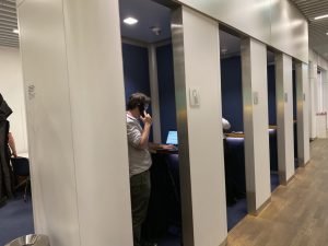 Nach dem Betreten befinden sich linker Hand direkt die loungeeigenen sanitären Einrichtungen inklusive Duschen. Geradeaus befinden sich rechts an der Wand Workstations, die mit einer Trennwand mit Lücken optisch vom Rest der Lounge getrennt sind. Auf der anderen Seite der Trennwand befindet sich der Buffet Bereich mit einigen Sitzgelegenheiten (vor allem Hochtische).