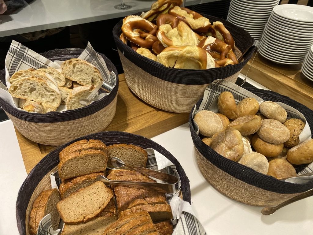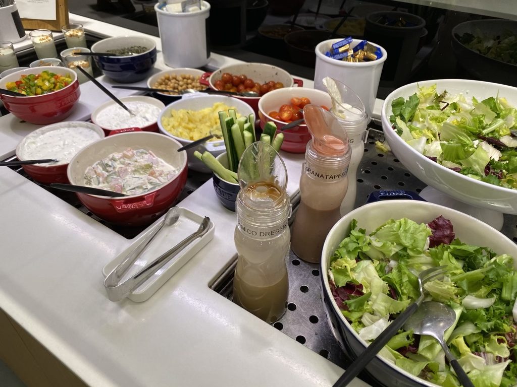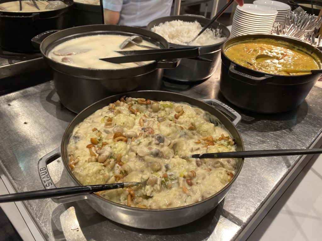 Um eines vorweg zu nehmen: Natürlich gab es auch Kartoffelsalat und Wiener ;). Insgesamt bietet die Lounge eine kleine Auswahl an kalten und warmen Speisen. Bei unserem Besuch gab es Semmelknödel, Thaicurry und eine Käsesuppe. Auch ein Salatbuffet und mehrere Nachtische stehen bereit.