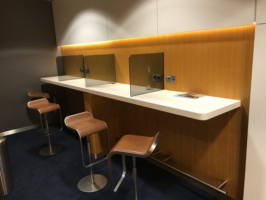 Ein leicht abgetrennter Arbeitsbereich bietet in der Senator Lounge noch mehrere mit Steckdosen ausgestattete Arbeitszonen.