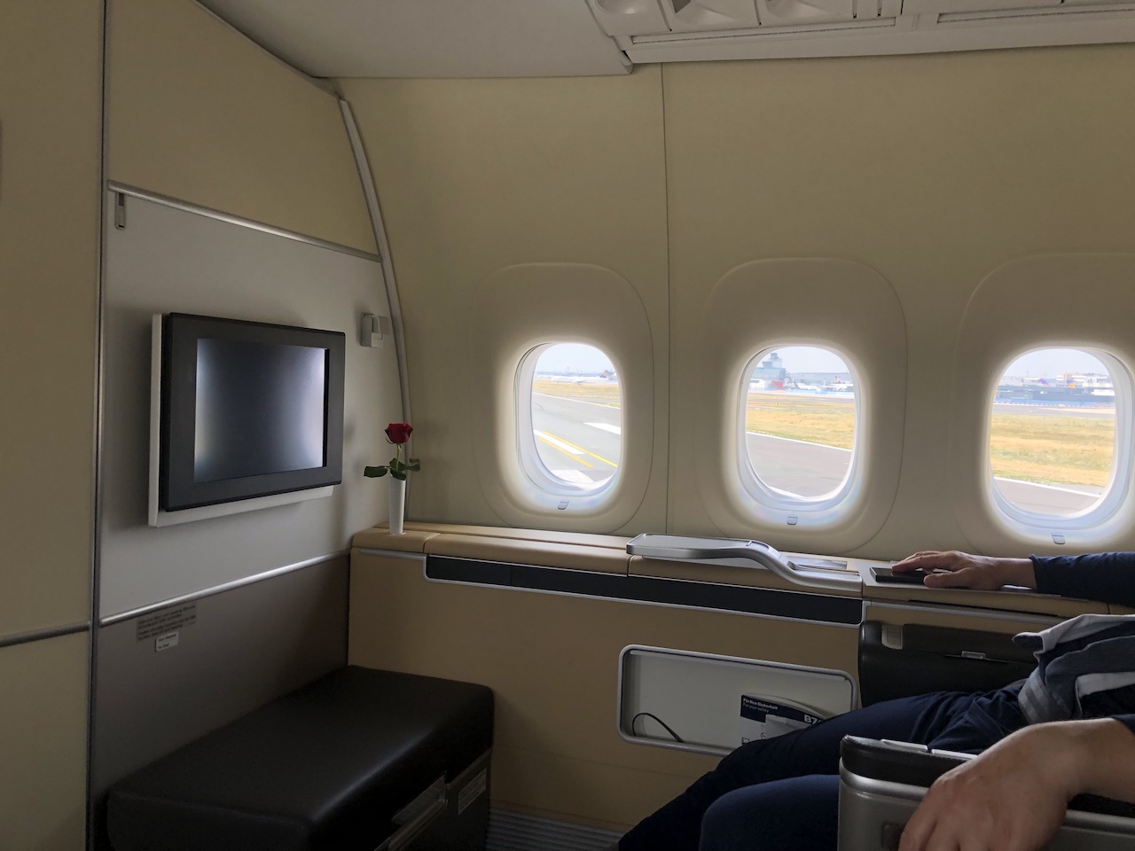 Die First war heute ausgebucht, unter den acht Passagieren war auch ein Ehepaar auf 3A und 3D, man kann als gemeinsam Reisende also durchaus auch über den Gang sitzen und die Trenwannd der Mittelkonsole im mittleren Sitzpaar nutzen.