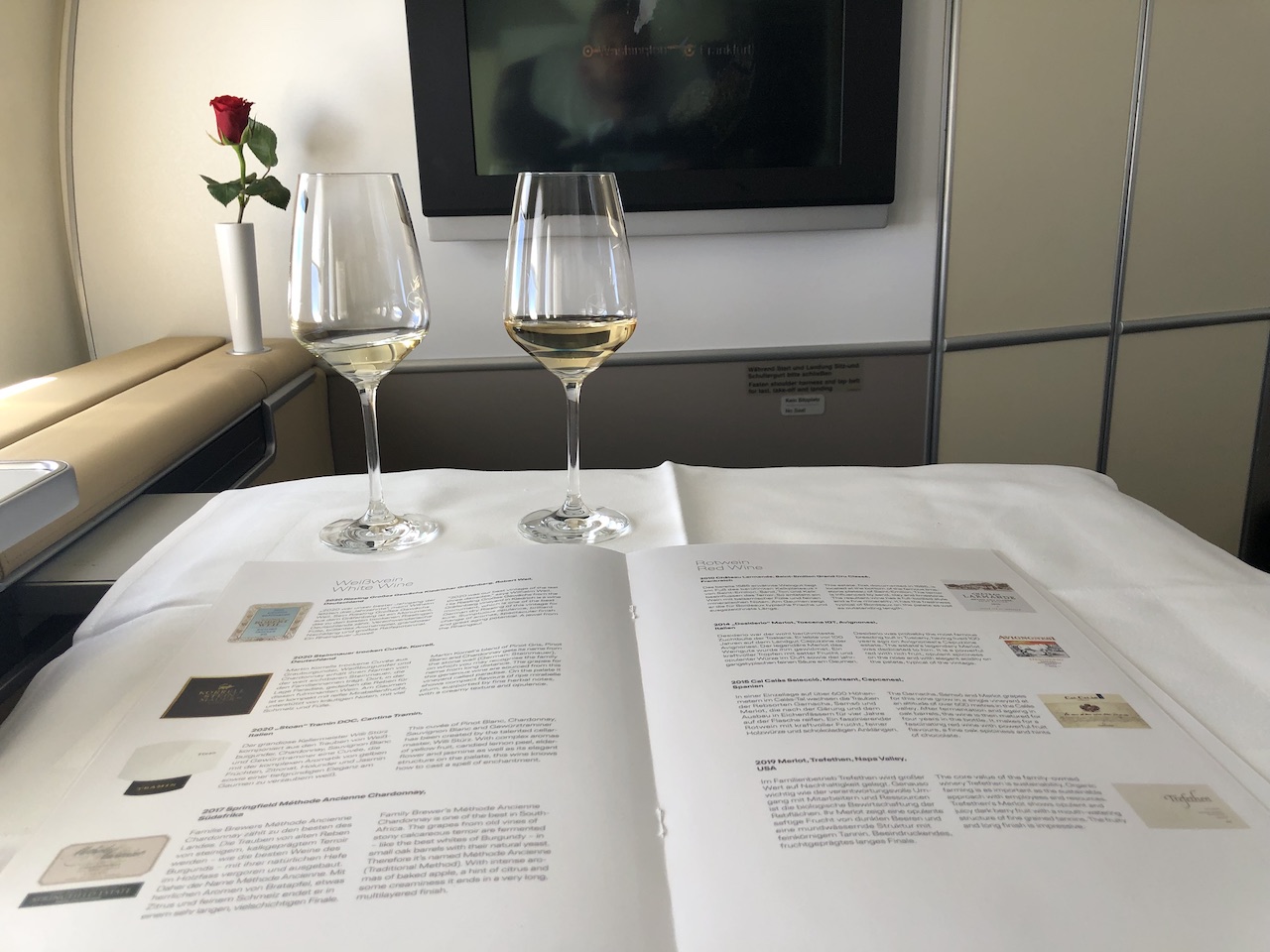 Von einem Wagen wurde nun der Tisch eingedeckt, beim Studieren der Weinkarte bot mir die Stewardess eine kleine Weinprobe an. Leider war einer der von mir gewünschten Tropfen nicht an Bord, im Handumdrehen wurden aber gleich zwei Alternativen gebracht.