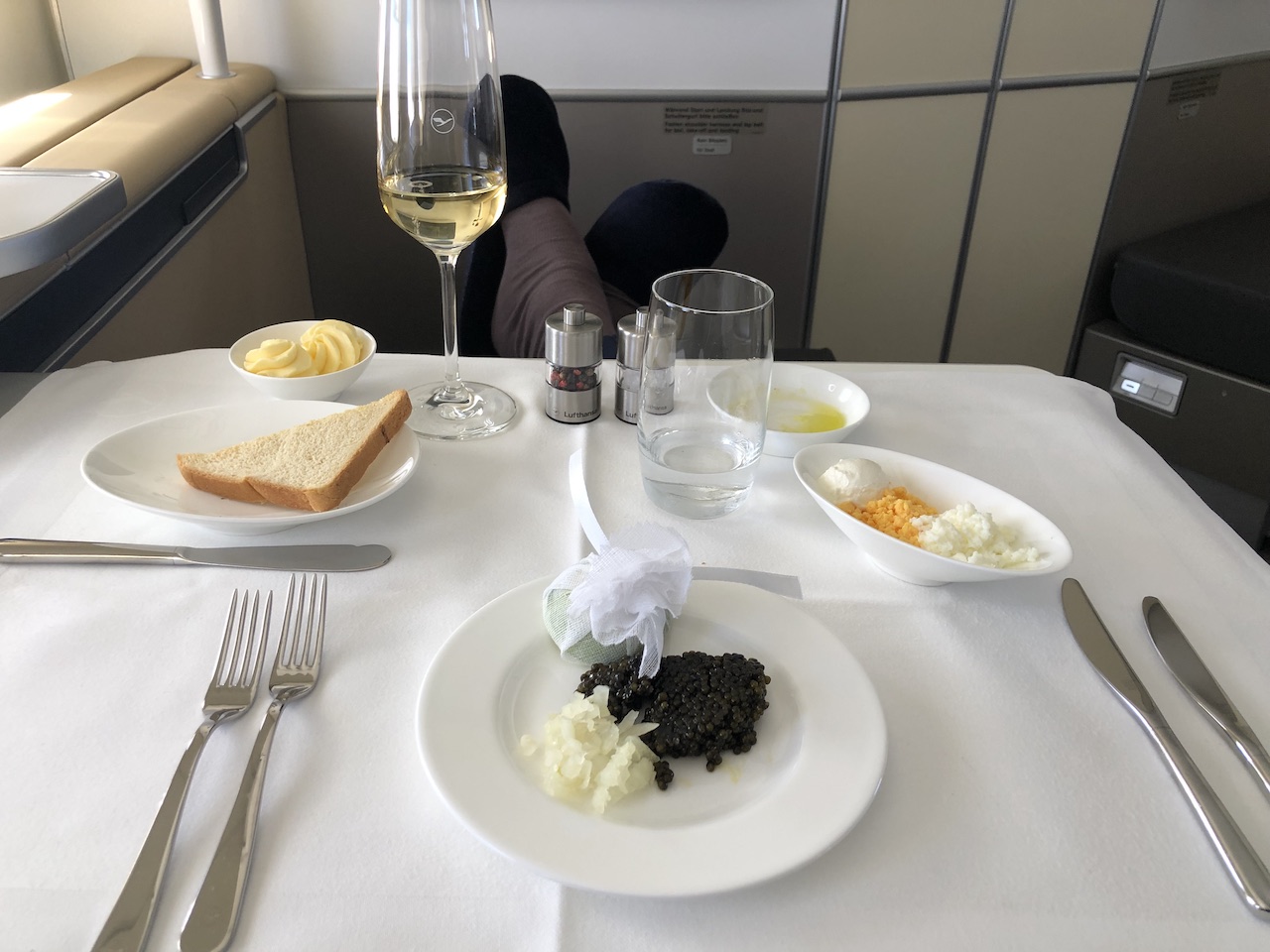 First Class ist und bleibt dennoch etwas Besonderes, weil es zumindest für mich alles andere als alltäglich ist. Vielleicht haut einen die Luxusklasse beim Kranich nicht sofort um, denn diese kommt ganz ohne abschliessbare Suiten, überdimensionale Monitore, Dom Perignon und viel „Bling Bling“ aus. Ein Stück weit hat mich aber genau das auch begeistert. Der Komfort kam jedenfalls nicht zu kurz, Service und Catering sind umfangreich.