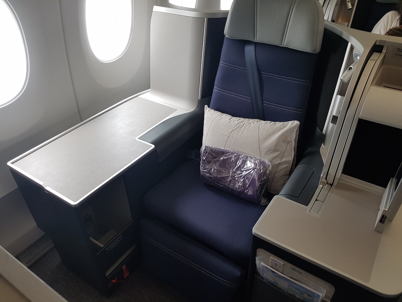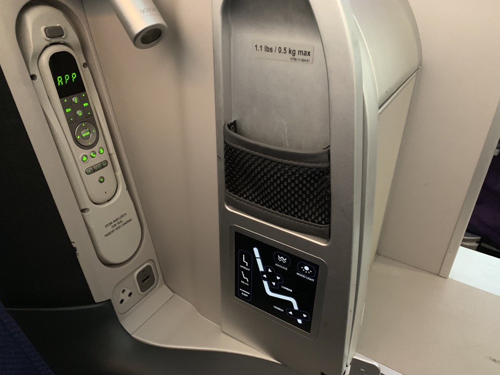 Ich habe mich für Platz 1K entschieden, was eine wirklich gute Wahl war und in meinen Augen auch der beste Sitzplatz im Flugzeug. So hat man auf diesem „Thron Sitz“ links und rechts neben dem Sitz zwei riesige Ablageflächen und auch das Fußfach ist angenehm groß. Die Nähe zur Bordküche kann etwas störend sein, allerdings hat es mich auf diesem Flug überhaupt nicht gestört.