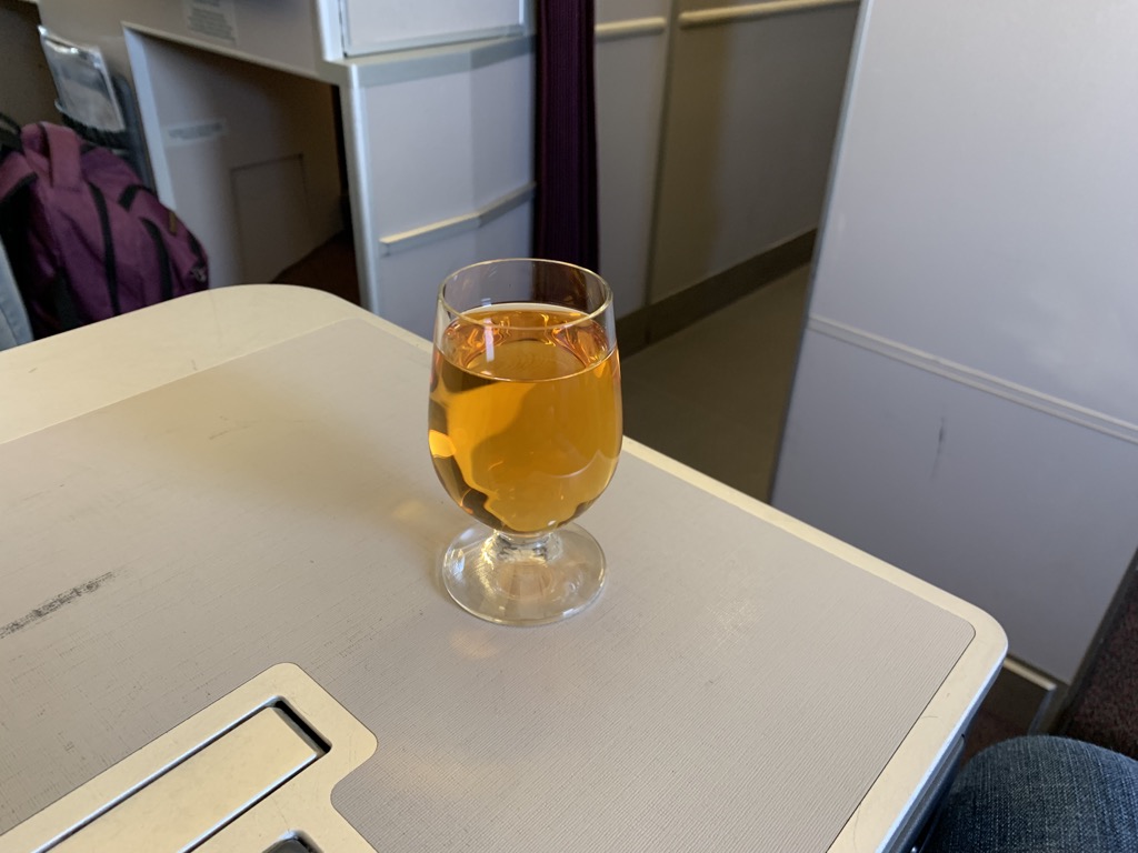 Zu Beginn des Fluges wurde ein Welcome Drink angeboten. Hier hatte man nur Wasser und Apfelsaft auf dem Tablett, allerdings hätte man auch andere alkoholfreie Getränke aus der Küche geholt. Mir wurde gesagt, dass man Alkohol am Boden mit geöffneter Tür nicht servieren könne. Dies ist vermutlich eine Sparmaßnahme, denn wenn man am Boden Alkohol ausschenkt, wird dieser auch besteuert.