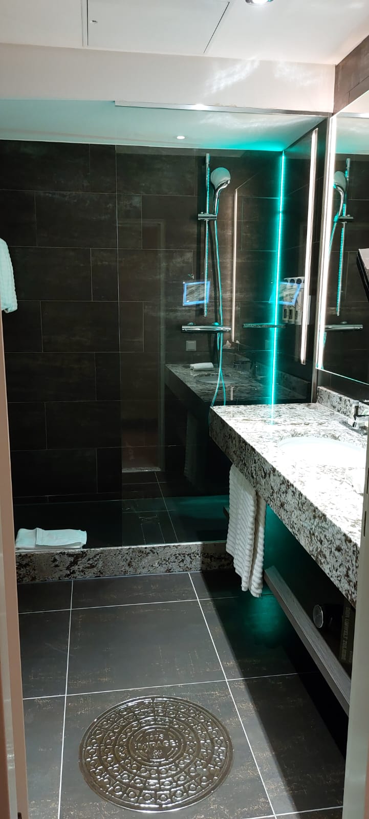 Das Bad ist leider ziemlich winzig geraten, man kommt aber zurecht. Es steht aber in keiner Relation zum restlichen Zimmer. Die üblichen Pflegeprodukte wurden in kleinen Größen bereitgestellt, in der Dusche sind große Flaschen für Schampoo & Co angebracht.